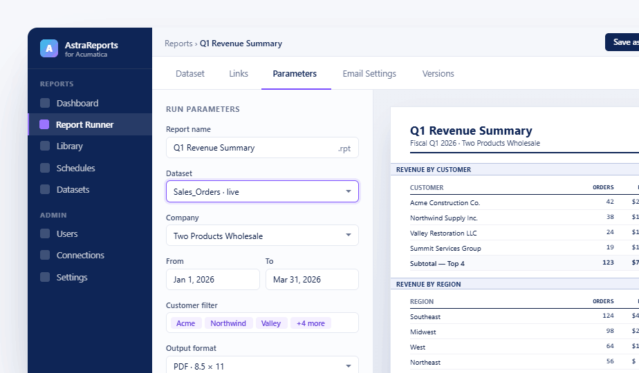 AstraReports is a reporting layer between Acumatica and SAP Crystal Reports. It lets you design and run highly formatted reports against Acumatica data without exporting to Excel or building custom code.