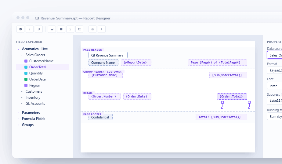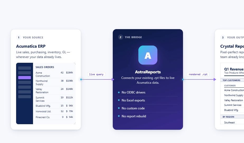 AstraReports is the only purpose-built Acumatica Crystal Reports integration. Create pixel-perfect reports on live ERP data — no ODBC drivers, no custom code.